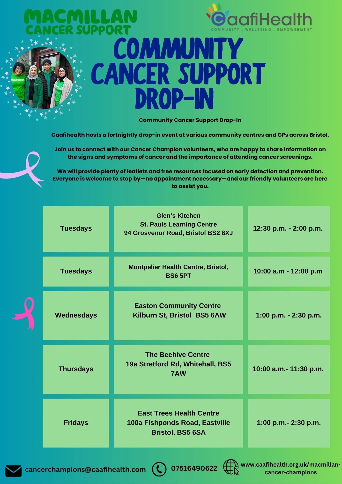 Dates and times of our Community Cancer Support Drop In